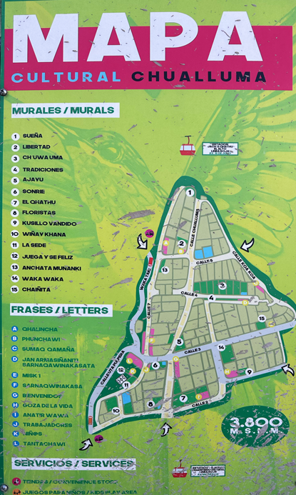 Das Projekt wurde gemeinsam mit den Anwohnern und Künstlerkollektiven umgesetzt – nicht nur zur Ver-schönerung des Viertels, sondern als Symbol für Stolz, Identität und sozialen Wandel. Heute ist Chualluma ein Paradebeispiel für kreative Stadtentwicklung.