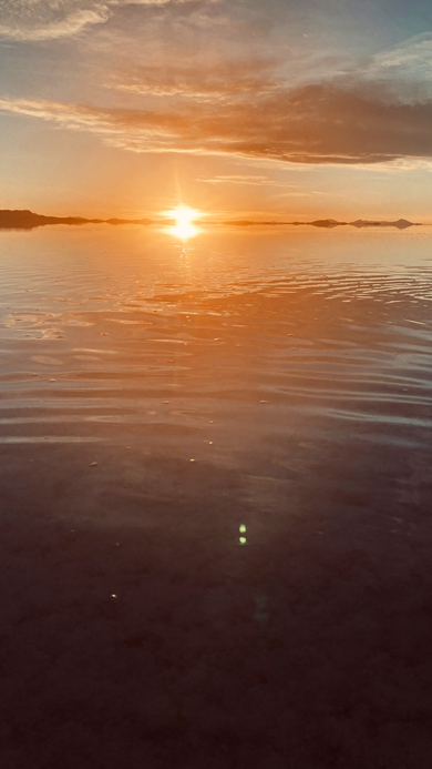 Salzpfanne bei Sonnenuntergang: Ein ma-gischer Moment, wenn die Sonne über dem endlosen Weiß untergeht.
