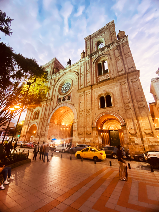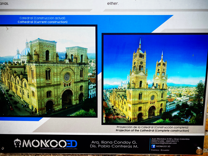 Wir sprechen über Neujahrstraditionen: Mänchen basteln, die Silvester verbrannt werden und die auch im Pumapungo ausgestellten Crazy Cows: Aus Pappmachee gebaute Kühe, die jemand über die Schultern gehängt bekommt und mit Feuerwerk bestückt sind. Dann wird dieses angezündet und der Träger tanzt durch die Festmenge. Absolut illegal. Aber man kann sie für Feste ausleihen?!? Wir bekommen erklärt, dass die Kathedrale keine Türme und keine Glocken hat, da das Gewicht zu groß fürs Fundament geworden wäre. Die lange Bauzeit und Architektenwechsel haben die Fehlplanungen noch begünstigt. Ein großer Riss im Portal ist warnendes Zeichen.