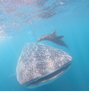 Nach 2 kurzen Mantasichtungen gab es dann leider keine Orcas. Dafür völlig unverhofft: Ein 8 Meter langes Walhai-Weibchen. Wahnsinn!
