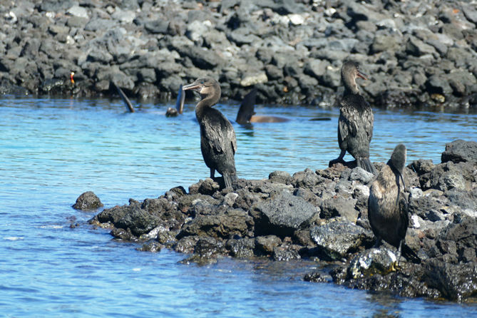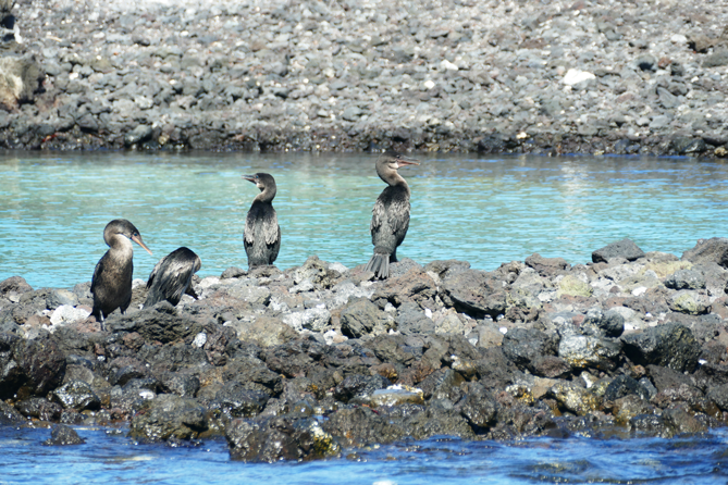 Nach einer wirklich langen Fahrt besuchen wir planmäßig und schnorchelnd die kleine Kolonie der flugunfähigen Kormorane.