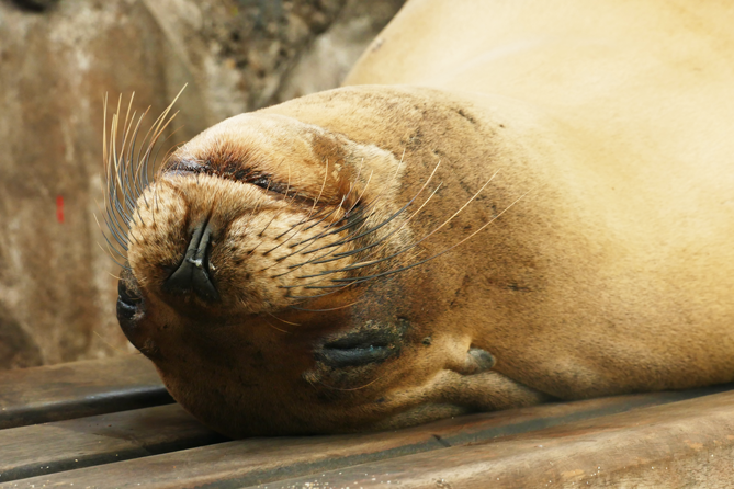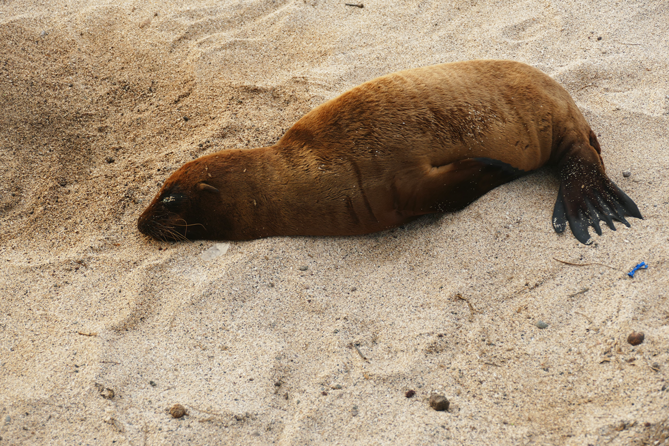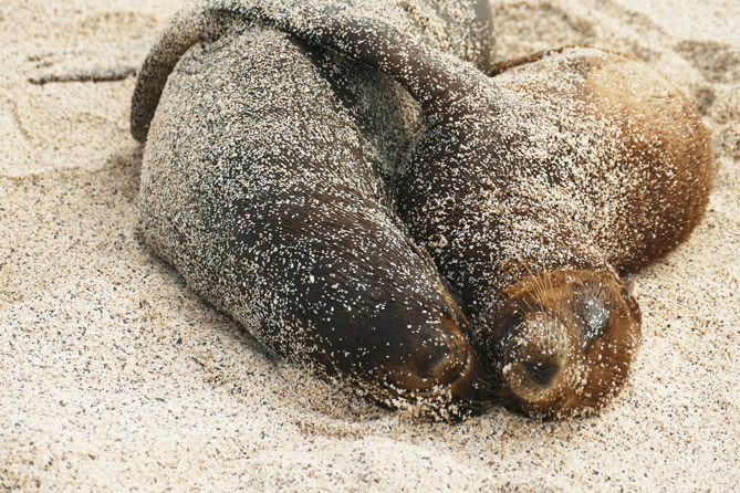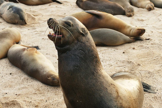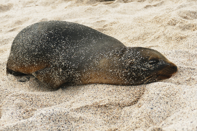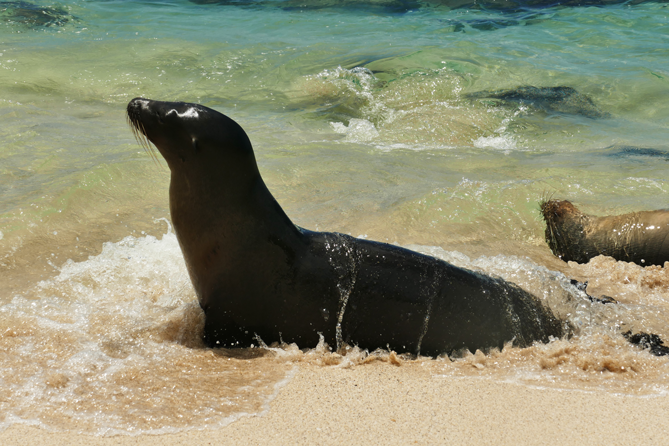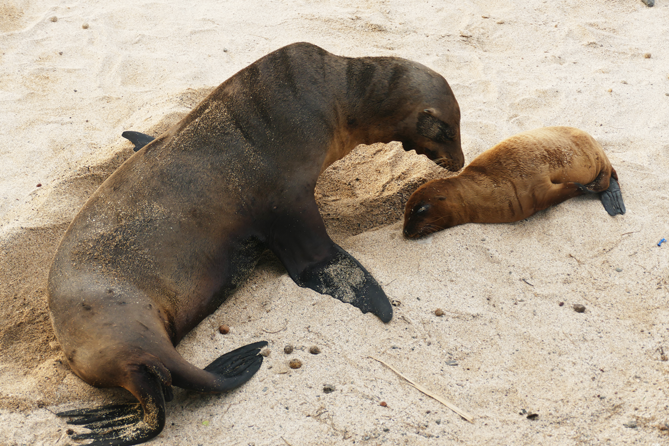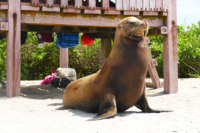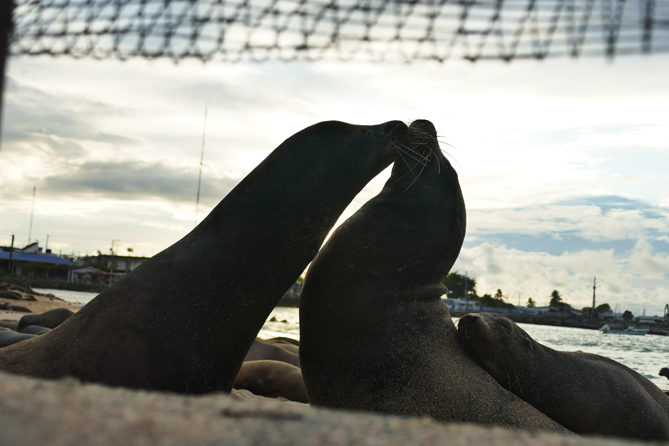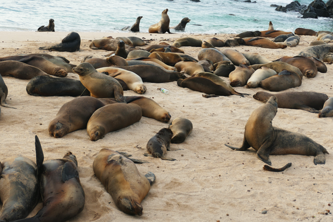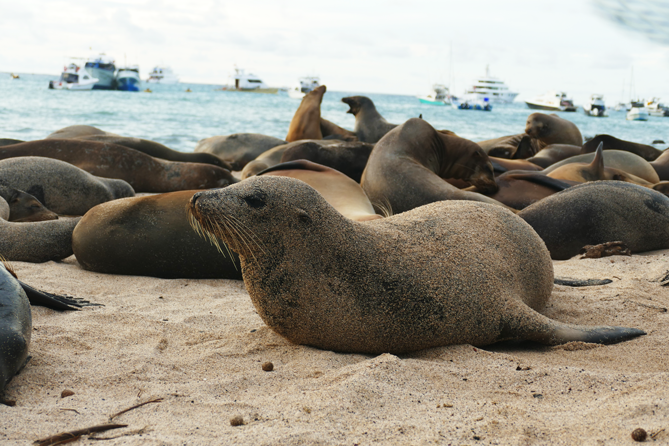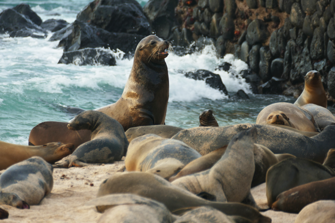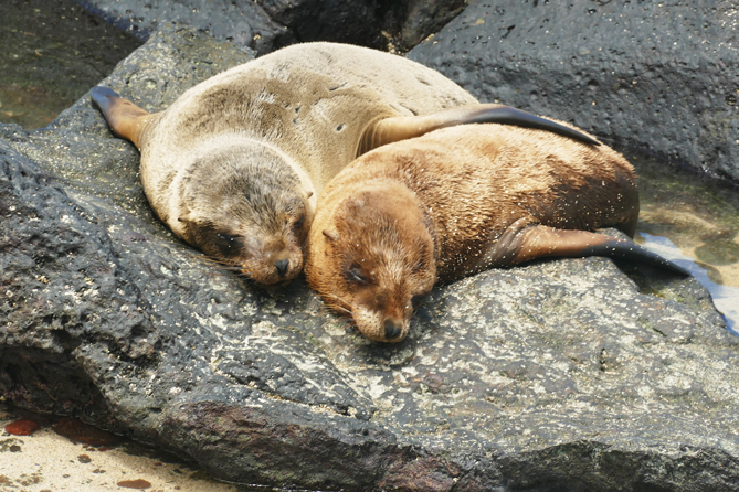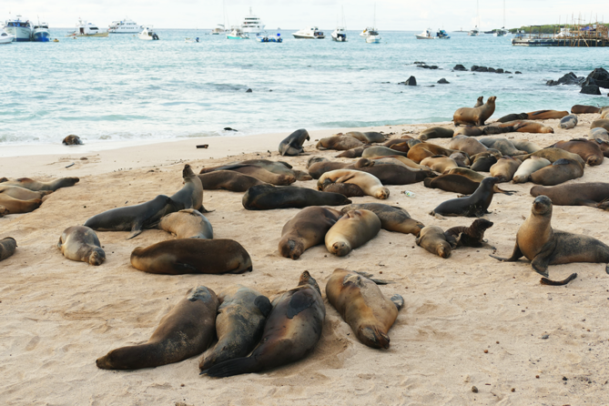Mehr Galapagos- Seelöwen als hier werdet ihr nicht finden. Die Insel ist voll von ihnen. Schnorchelt mit diesen verspielten kleinen Kerlen! Wenn ihr sie lieber mit etwas Abstand und trocken beobachten wollt: einfach die Hauptpromenade entlang gehen – es gibt buchstäblich Hunderte von ihnen, die auf den Felsen schlafen oder den Kleinen in einer Art Schwimmbecken das Schwimmen bei-bringen.