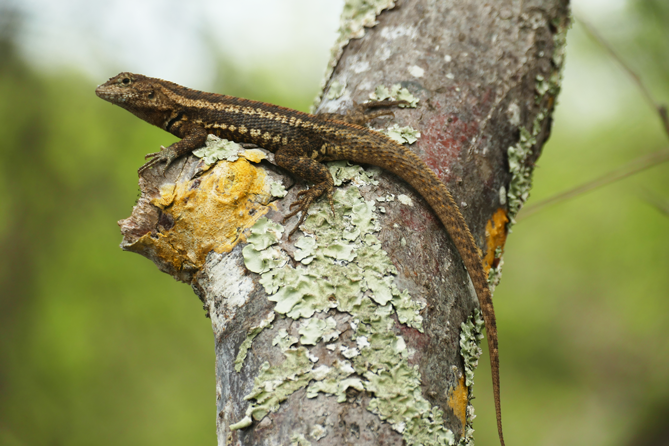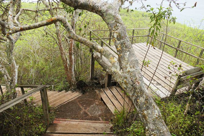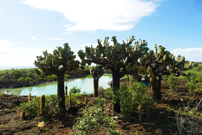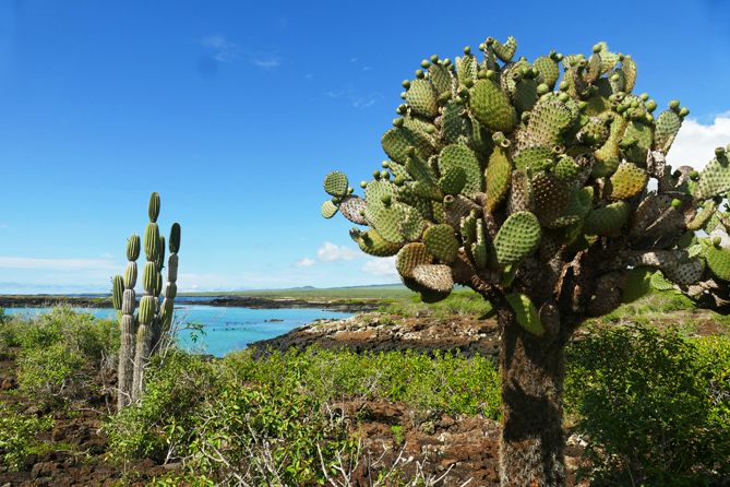 Die Inselmitte ist feucht und fruchtbar mit einem Süßwassersee im üppig grünem Hochland. Große Scalesia Wälder und dichter Busch – der perfekte Lebensraum für die Galapagos-Riesenschildkröte – bedecken Teile dere Insel. Weiter unten entlang der Küste verwandelt sich die Landschaft in Korallenstrand, Mangroven, Kaktuswald und trockenes Gestrüpp.
