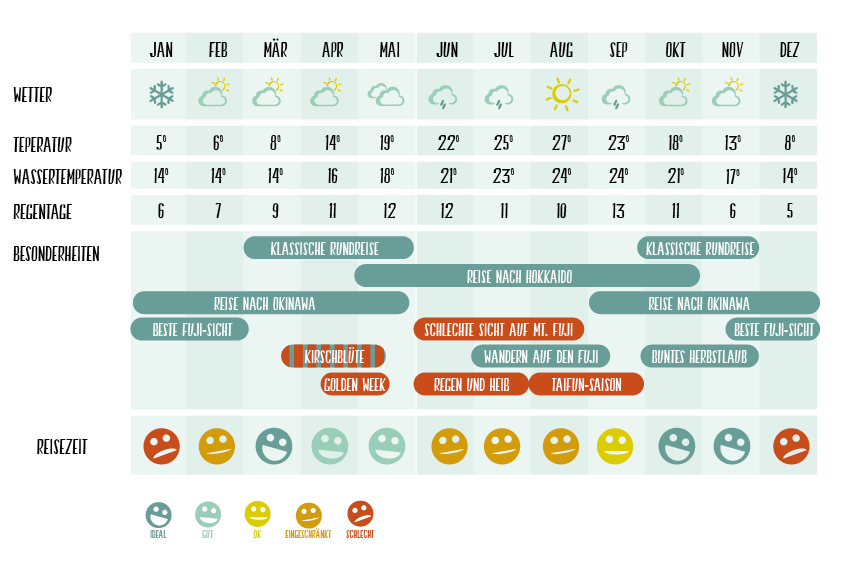 Beste Reisezeit: Mai bis Oktober. Beachte jedoch, dass es auf Yakushima sehr viel regnet – im Juni ist Regenzeit. Mai und Oktober sind meist etwas trockener.