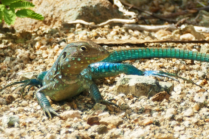 Typisch für den Aruba-Peitschenschwanz sind die leuchtenden Farben. Die Männchen schimmern oft in kräftigem Türkis oder Blau, während die Weibchen und Jungtiere meist brauner gefärbt sind und weiße Streifen tragen. Gerade in der Sonne kommen die Farben richtig zur Geltung – perfekt, um schöne Fotos zu machen, wenn du sie erwischst.