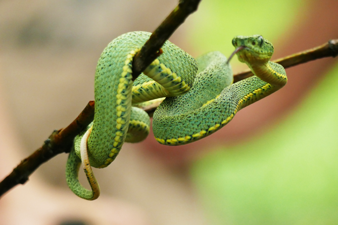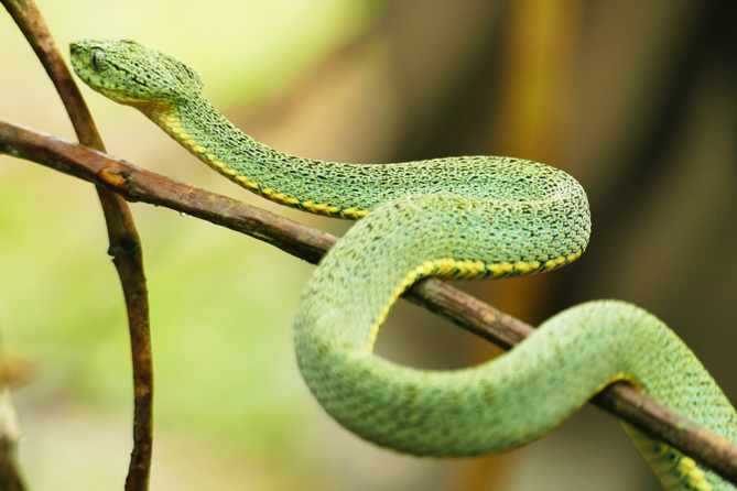 Diese elegante Viper lebt hauptsächlich im tropischen Regenwald Amazoniens, gut getarnt zwischen Blättern und Lianen. Ihre smaragdgrüne Färbung macht sie praktisch unsichtbar.