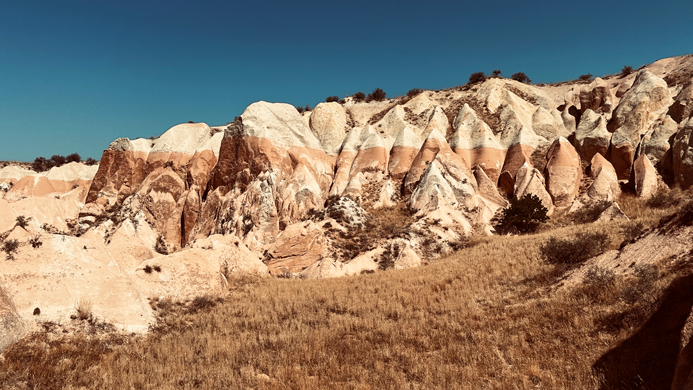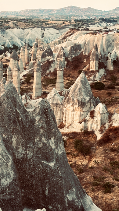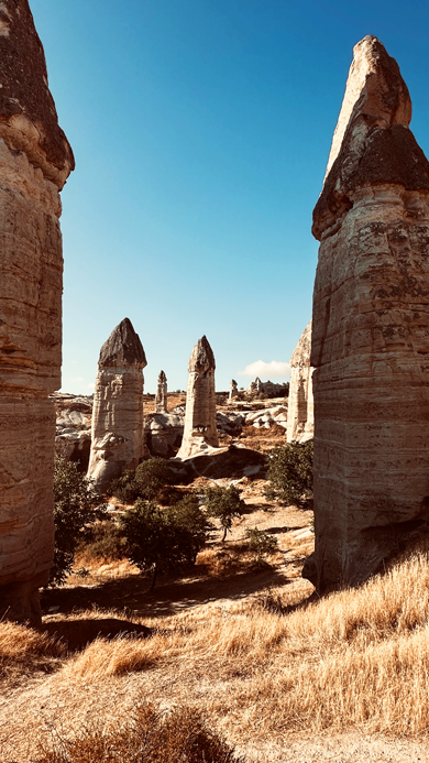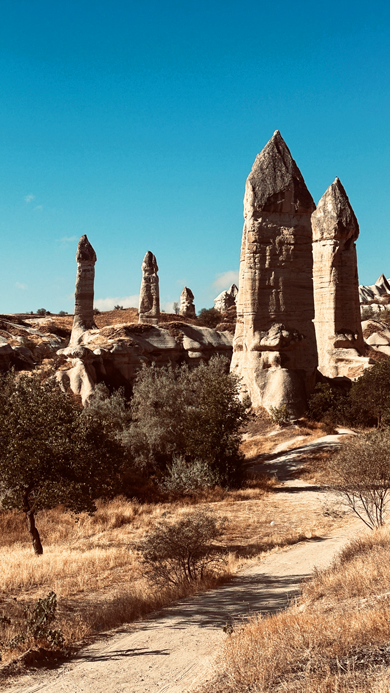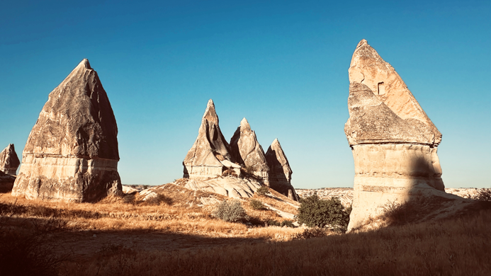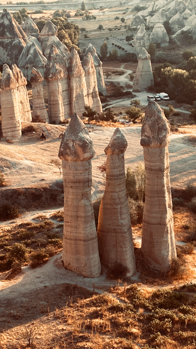 Wir passieren das Göreme Open Air Museum und fahren als erstes zu den 3 Beauties. Hübschen Felsnadeln an der Straße zwischen Ortahisar und Ürgüp. Für den aufgerufenen Parkpreis von 70 Lira findet sich kein Abnehmer. Ist wohl noch zu früh… Also umsonst geparkt und ein paar erste wunderschöne Eindrücke gesammelt.