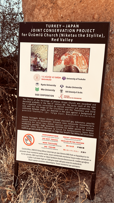 Hier weißt ein Schild auf die Kirche hin (es geht mehrerer Leitern hoch und durch enge Höhlen). Ich denke noch: den kurzen Abstecher mach ich. Und befinde mich dann doch auf einmal auf einer längeren Tour. Vom Roten Tal sehe ich also von unten nix. Der Weg führt mich wieder hoch Richtung Rose Valley und plötzlich stehe ich in einem kleinen Weinberg. Dahinter ragt auch die Kirche und das Alte Weinlager auf. Also beschließe ich, dass das meine Tour heute beendet. Man könnte noch am Cafe an der Kirche eine Erfrischung nehmen – ich wandere aber das kurze Stück zurück zu meinem Ausgangspunkt. Alles in allem ein ich recht zügig gegangen, habe viele Fotos gemacht , 1 Liter Wasser getrunken und dafür 1:15 Stunden gebraucht.
