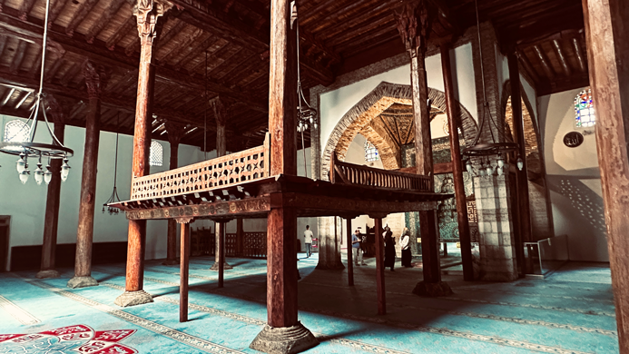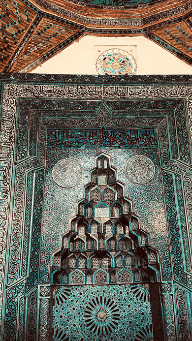 Das Innere ist mit farbigen Fayencen, Holzschnitzereien und geometrischen Mustern geschmückt.