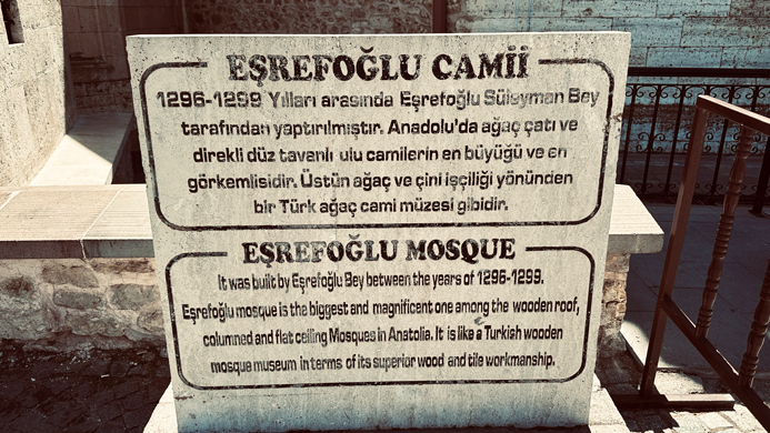 Die Eşrefoğlu-Moschee ist UNESCO-Welterbe (Holzsäulenmoscheen des Mittelalters). Sie ist nicht nur ein Gebetsort, sondern auch ein lebendiges Zeugnis dafür, wie Menschen im Mittelalter mit Naturmaterialien nachhaltig und zugleich monumental bauen konnten.