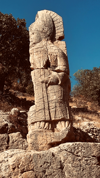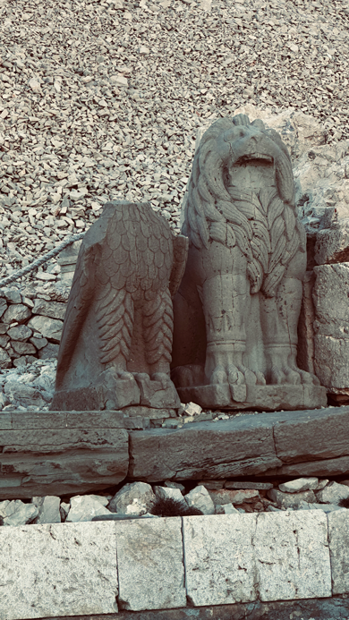 Rund um diesen Hügel sind drei Terrassen mit großen Statuen – insbesondere die Ost- und Westterrasse sind spektakulär: Gottesstatuen, Adler, Löwen … ein Mix aus griechischer und persischer Symbolik.