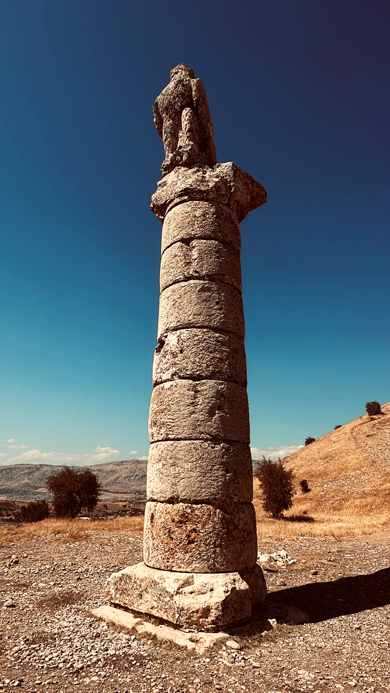 Um den Hügel stehen vier dorische Säulen (ursprünglich sechs), jede etwa 9 m hoch, mit Figuren auf den Säulenköpfen: ein Adler, ein Löwe, ein Stier und ein Relief mit dem Händedruck (Dexiosis) zwischen König Mithridates II und seiner Schwester Laodike.