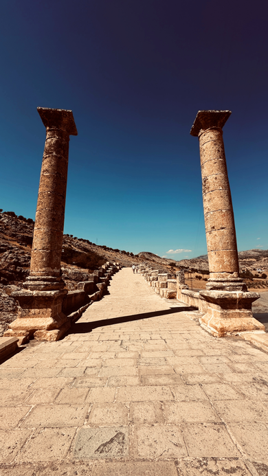 Auf beiden Seiten der Brücke stehen hohe Säulen (jeweils etwa 9–10 m) Zwei Säulen sind dem Kaiser Septimius Severus und seiner Frau Julia Domna, zwei weitere seinen Söhnen gewidmet.