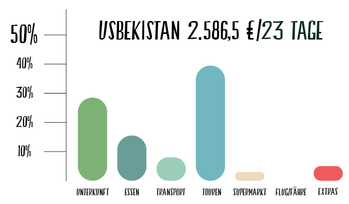 folgende Kosten sind unter Tour aufgeführt: Medresse Tasckent: 1 Euro (1x), Automuseum: 7 Euro, Registan: 14 Euro, Amur Timur Mausoleum: 10.5 Euro, Aksaray-Mausoleum: 1 Euro (1x), Ulug-Beg-Observatorium: 3 Euro (1x), Shah-I-Zinda: 3.5 Euro (1x), Nuratau-3-Tagestour: 462 Euro, Pteroglyphen: 3 Euro, Sommerpalast Buchara: 8.5 Euro, Wassermuseum Buchara: 1 Euro (1x), Ark Buchara: 8.5 Euro, Xiva-2-Tagesticket: 35.5 Euro, Mausoleum Xiva: 2 Euro (1x), Stadtmauer Xiva: 3 Euro (1x), Aralsee-2-Tagestour: 453 Euro, Museum Moynak: 2.5 Euro (1x) . Alle Preise für 2 Personen. Außer: (1x)