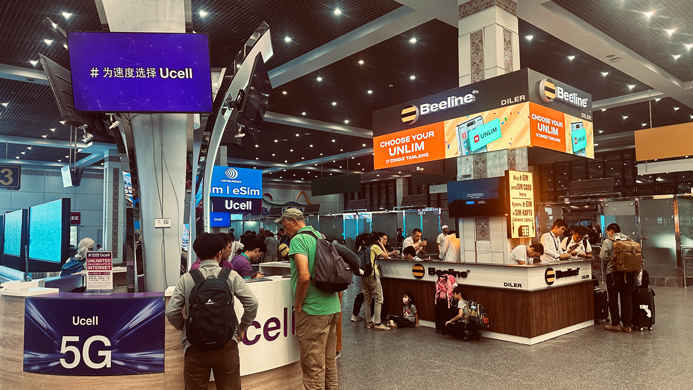 Lokale SIM-Karten sind extrem günstig (z. B. Ucell, Beeline). Beide haben Schalter am Flughafen in Taschkent (an den Kofferbändern – fanden wir sehr praktisch)