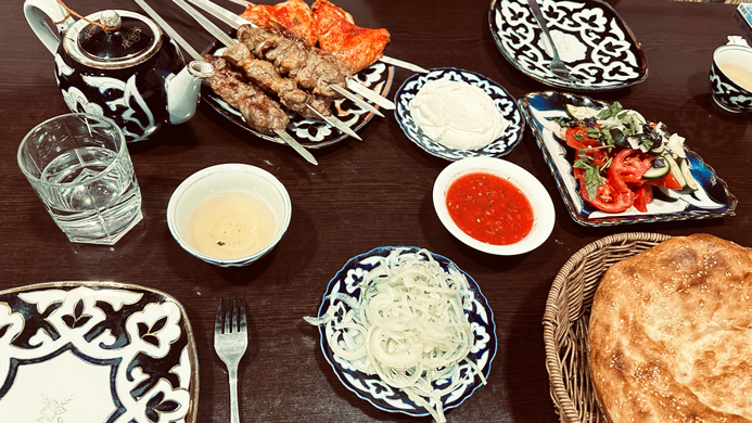 Shashlik (Kebab) – Fleischspieße über Holzkohle gegrillt, oft aus Lamm, Rind oder Huhn.