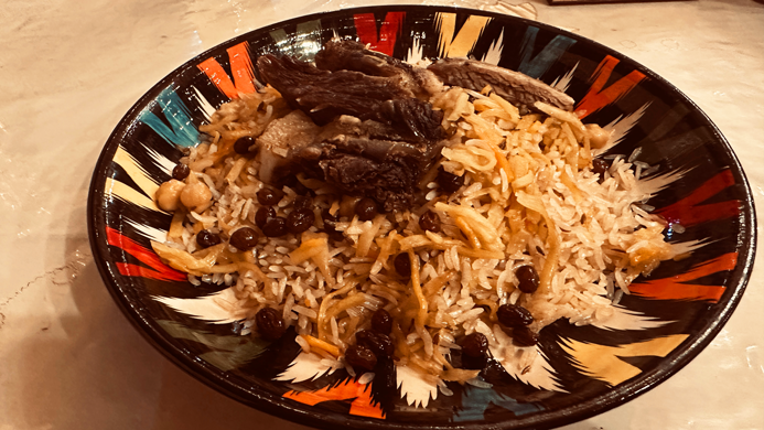 Plov – Das Nationalgericht: Reis mit Lamm oder Rind, Karotten, Zwiebeln und Knoblauch, langsam gegart. Jede Region hat ihre eigene Variante.